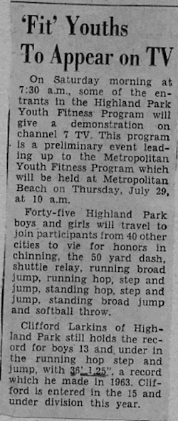 Clifford Larkins of Highland Park still holds the record for boys 13 and under in the running hop step and jump, with 36’ 1.25”, a record which he made in 1963. Clifford is entered in the 15 and under division this year.