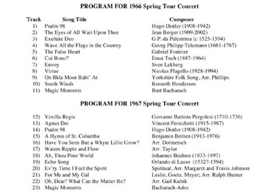 The 1966 and 1967 Spring Concerts CD is apart of a 5-CD box set, which Dr. Larkins produced and distribute free of charge to as many choir members from 1954-1969 as he could find. The box set also includes a 28 page booklet. You can hear clips of this CD as well as clips from some of the others on this website. below you will find links to selected music from the "1966 and 1967 Spring Concerts CD". If you would like more information, please contact Dr. Clifford Larkins at the e-mail address provide on the contact page.