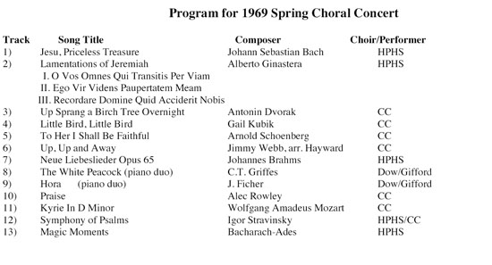 The 1969 Spring Concert CD is apart of a 5-CD box set, which Dr. Larkins produced and distribute free of charge to as many choir members from 1954-1969 as he could find. The box set also includes a 28 page booklet. You can hear clips of this CD as well as clips from some of the others on this website. below you will find links to selected music from the "1969 Spring Concert CD". If you would like more information, please contact Dr. Clifford Larkins at the e-mail address provide on the contact page.