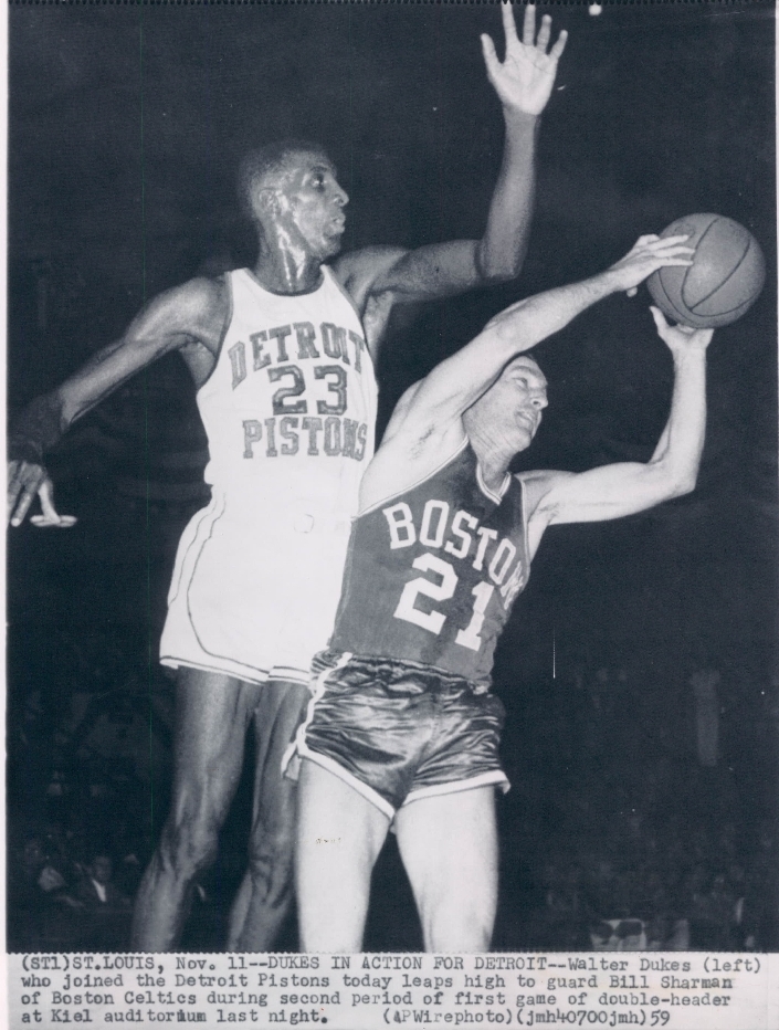 For some reason we were also given permission to use the Pistons’ locker room—perhaps to allow us to use the rest room. I will never forget one amazing incident that occurred as I raced through the open locker room door just as 6’ 11” center, Walter Dukes, was racing toward the door heading out for the court. I didn’t see him and he didn’t see me, and at 5’3” or 5’4” I literally ran between his legs and into the locker room. I have to assume that we avoided a collision because I ducked just as he leaped up, but I was shocked and amazed at the close call. Just think what might have happened if I hadn’t ducked when I did. The great Piston center may have had to perform the jump ball that game while in great pain!